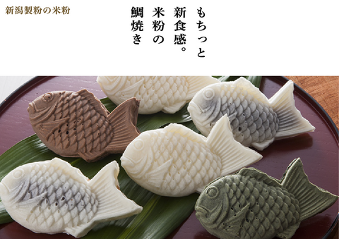 もちもち鯛焼きの生地には新潟県産コシヒカリの米粉を使用。あたためた時の柔らかさともちもちの食感、ふんわりと広がる米の香りにこだわりました。キメの細かい米粉を使用しているのでなめらかな口当たりです。